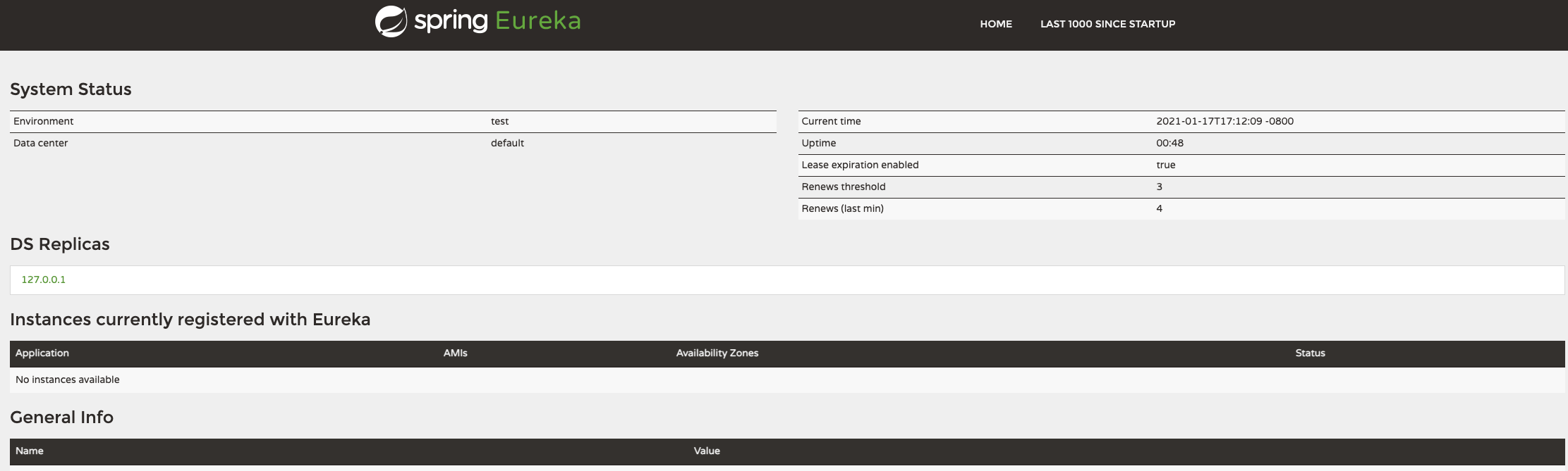 현재, 우리가 발견 서버를 구축하고 시작하여 http://localhost:8761를 통해 서버에 접근할 때,bellow와 유사한 내용을 볼 수 있습니다.다음 캡처는 프로그램이 아직 다른 서비스가 시작되지 않았기 때문에 항목이 없다는 것을 보여 줍니다.|