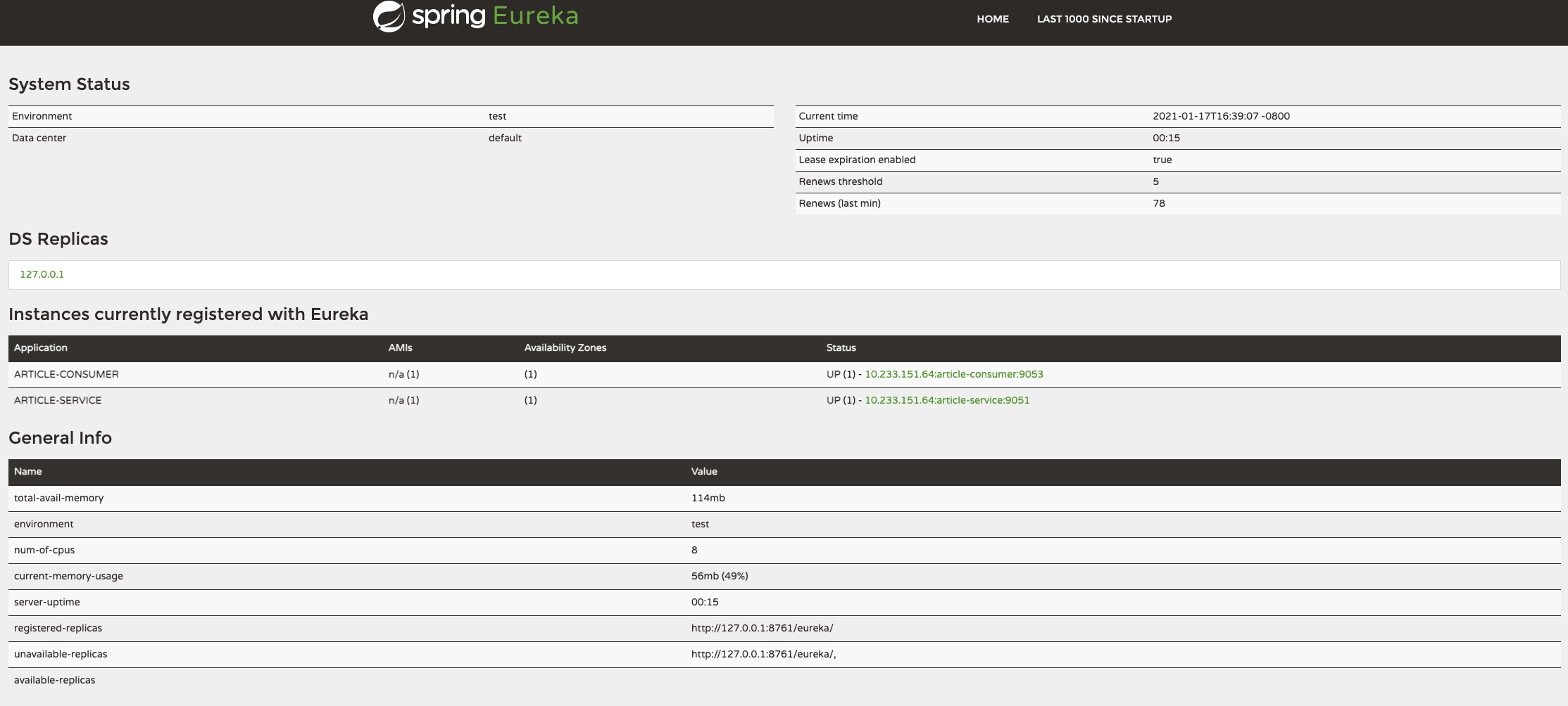 신청등록 정보## Server Relatedserver.port=9051## Eureka Relatedeureka.client.serviceUrl.defaultZone=http://127.0.0.1:8761/eureka/eureka.client.register-with-eureka=trueeureka.client.fetch-registry=falseeureka.vipAddress=article-service